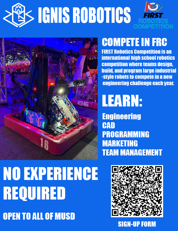 IGNIS Robotics is an Innovation Campus-centered robotics team open to all of MHS. We will be competing in the FIRST Robotics Competition, one of the largest robotics competitions in the world, wher...